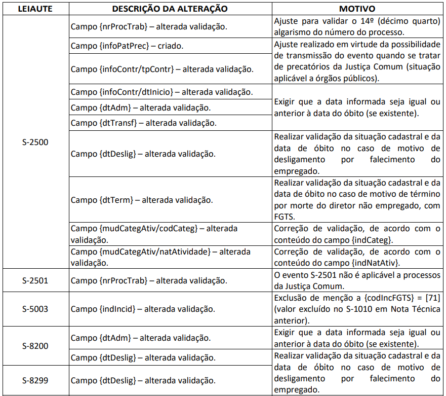 A atualização envolve modificações relevantes em eventos periódicos, não periódicos e de processos trabalhistas, com destaque para validações relacionadas a óbito, FGTS, classificação tributária e precatórios da Justiça Comum.